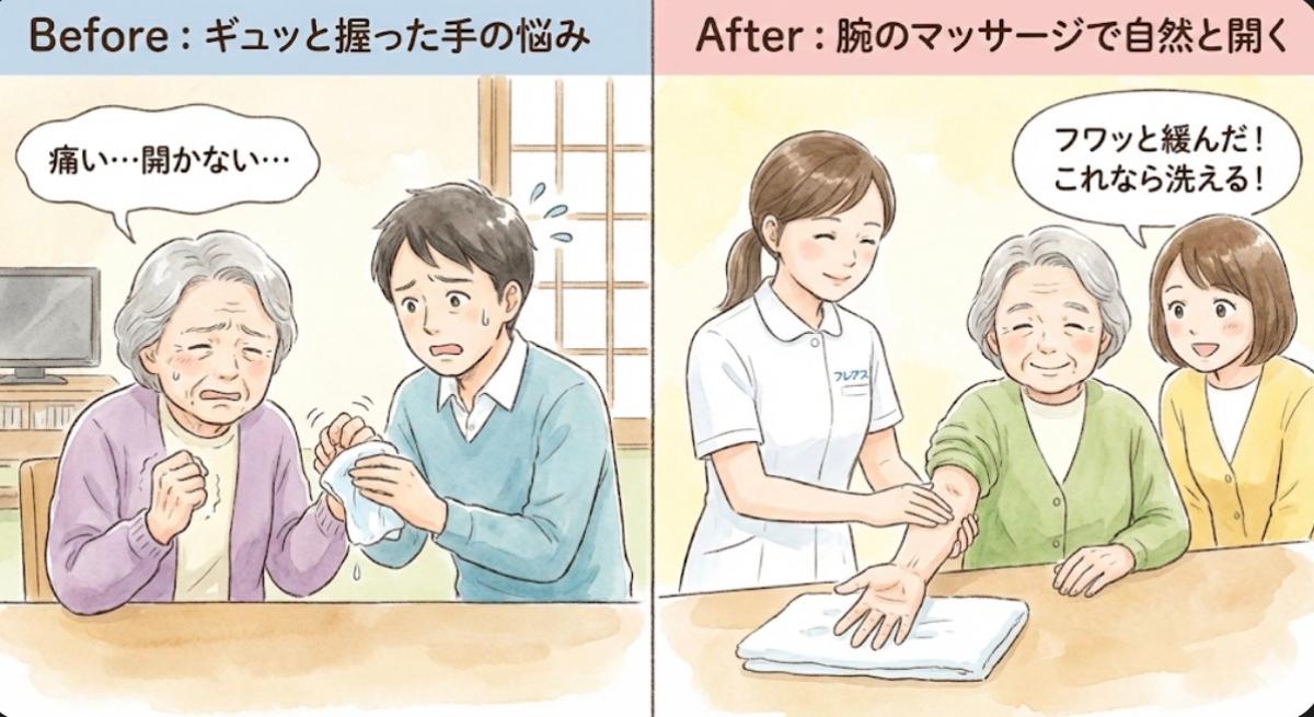「爪切りができなくて困っている」「手のひらの赤みが気になる」という利用者様がいらっしゃいましたら、ぜひ私たちにお任せください。その「ギュッと握った手」、私たちが優しくひも解きます。