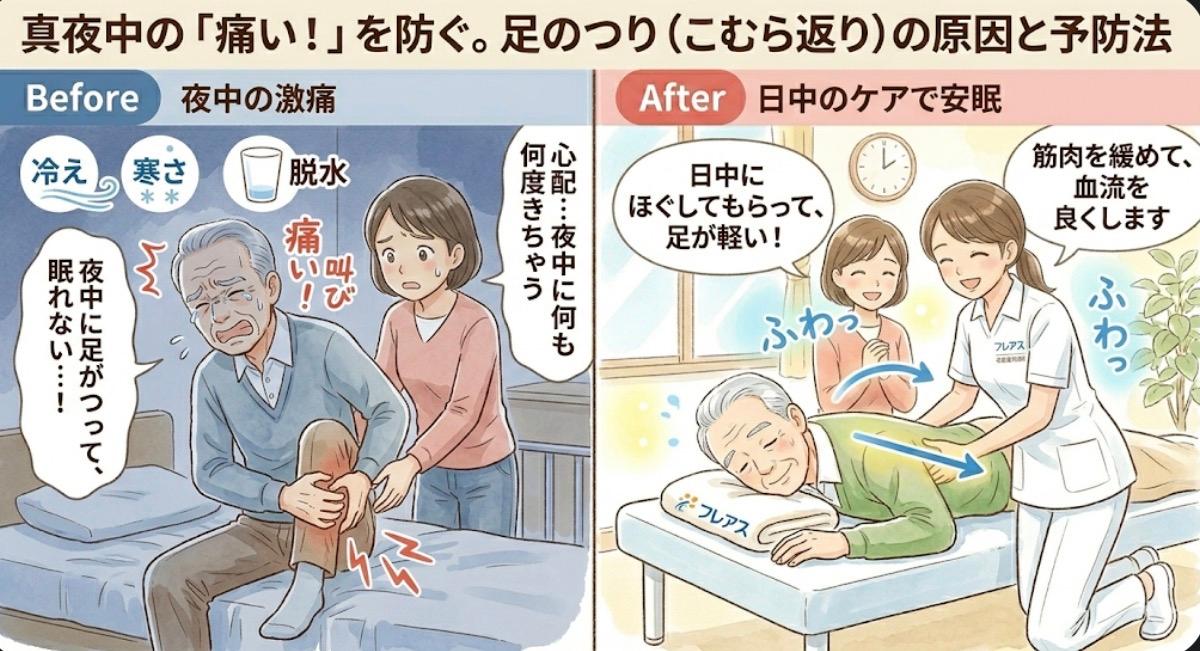 いわゆる「こむら返り(足のつり)」です。ご本人にとって激痛であることはもちろん、夜中に何度も起こされるご家族様や夜勤スタッフ様にとっても、深刻な睡眠不足の原因になってしまいます。